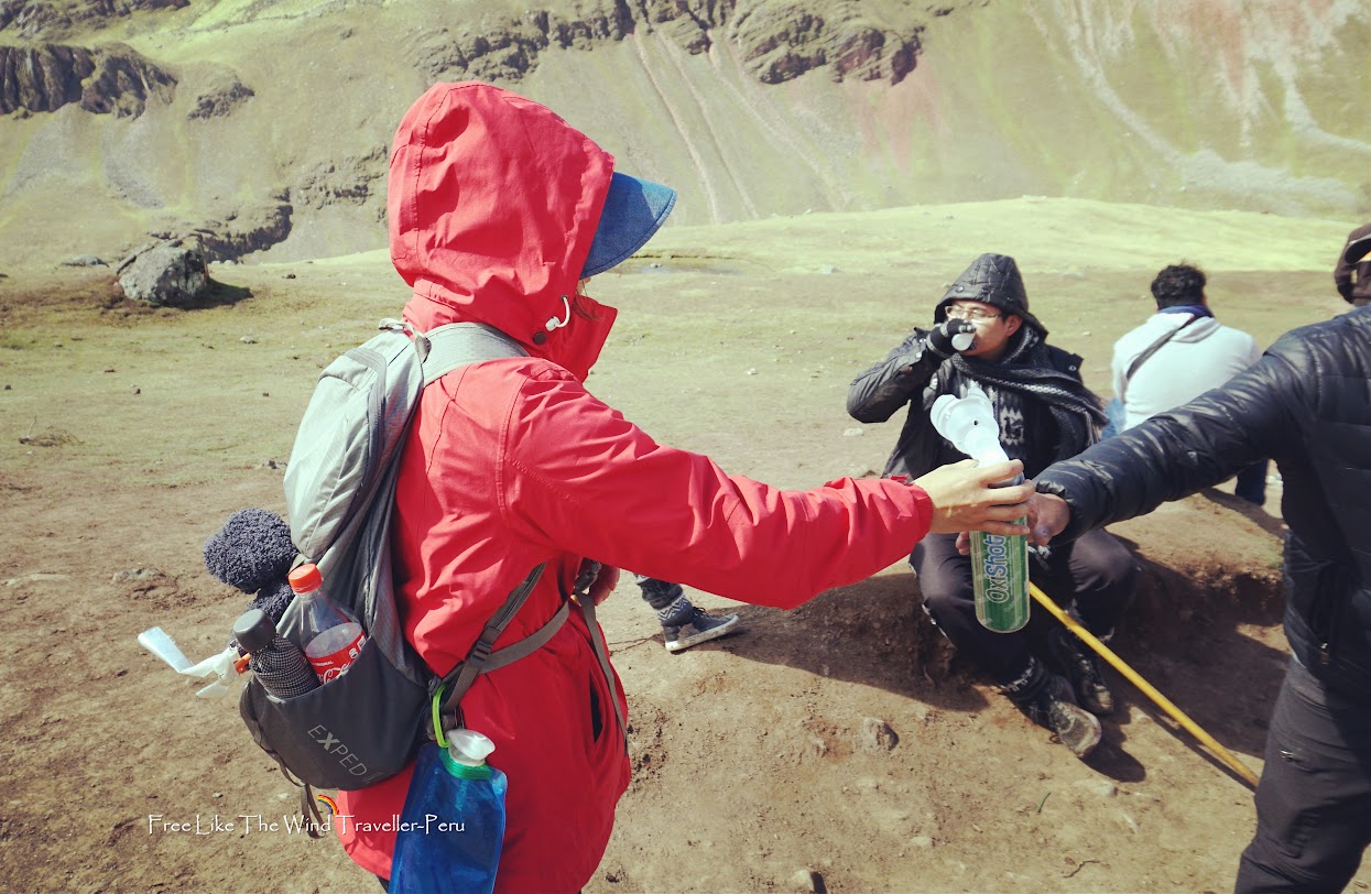 身旁許多的朋友,上山時因為體力的關係,乘坐著馬匹上山,下山時體力可能有點透支,身體不適,因此沿路可以看到貼心的導遊,拿出準備的氧氣罐,幫助呼吸比較困難的遊客。ps.這次登上彩虹山的,應該是有好幾個團,但這些團與團之間的導遊似乎都認識,並且都會一起照顧所有上山的遊客,這種感覺真的讓人很放心。
