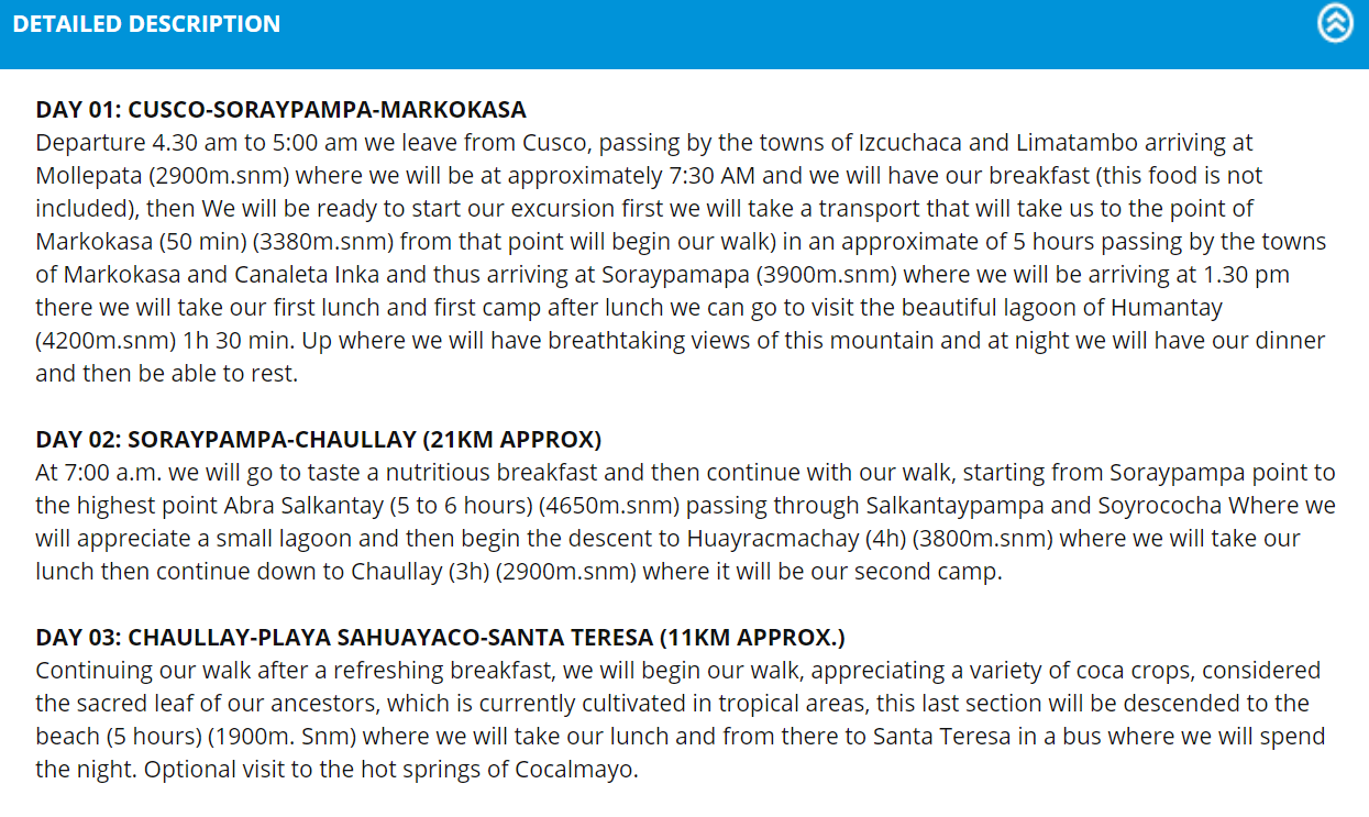 舉例來說自己搜索了一下Salkantay trek,就有看到幾的相關的旅行團,然後也跑出了價錢。價錢有高有低。